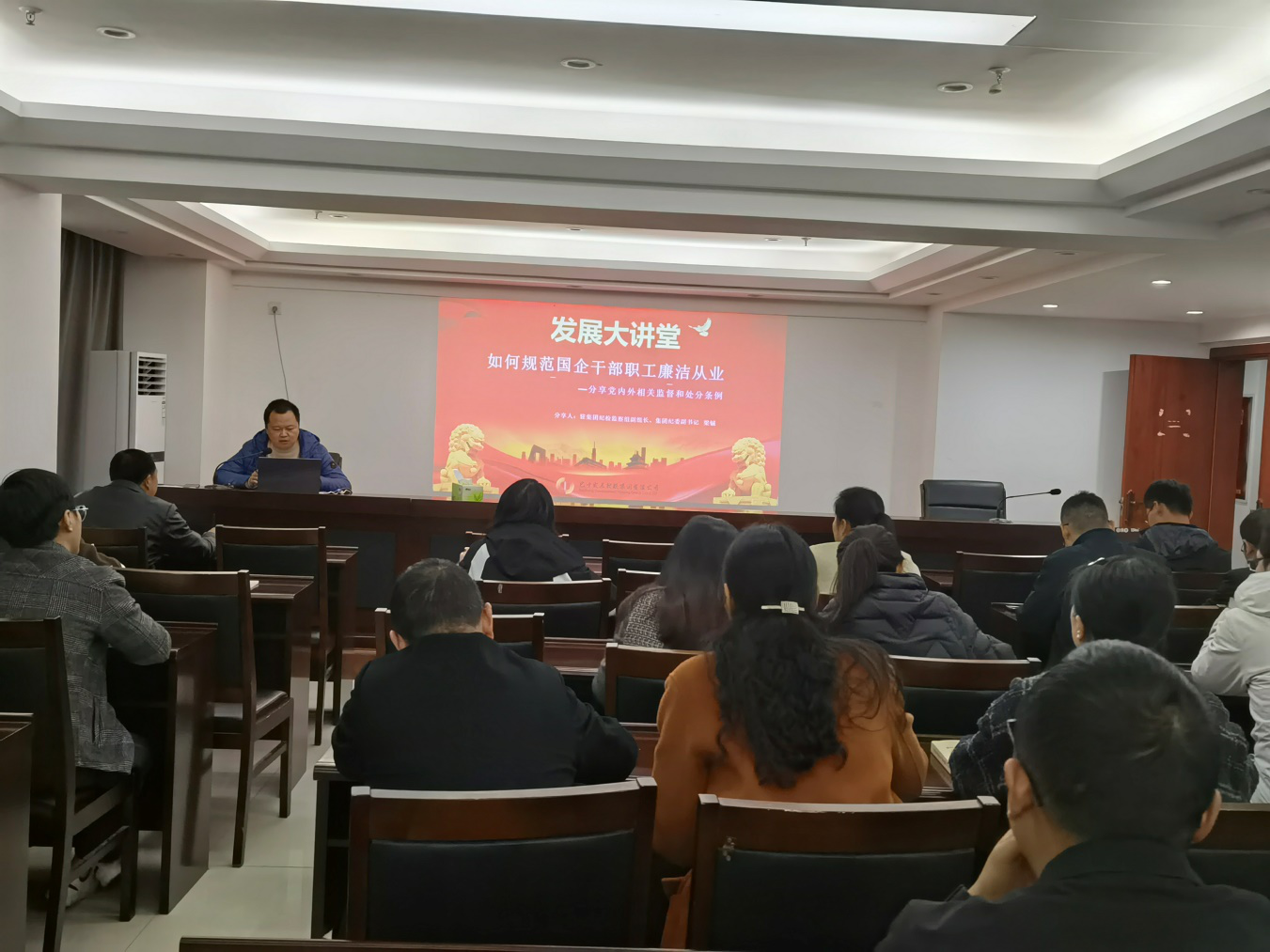 為充分營造集團(tuán)公司風(fēng)清氣正的干事創(chuàng)業(yè)環(huán)境,筑牢干部職工思想防線,守住從業(yè)廉潔底線,2023年12月1日,市紀(jì)委監(jiān)委駐巴中發(fā)展控股集團(tuán)紀(jì)檢監(jiān)察組利用“發(fā)展大講堂”,為集團(tuán)干部職工上了一堂以“如何規(guī)范國企干部廉潔從業(yè)”為主題的廉潔教育課,并觀看了警示教育片“失控的權(quán)力”。