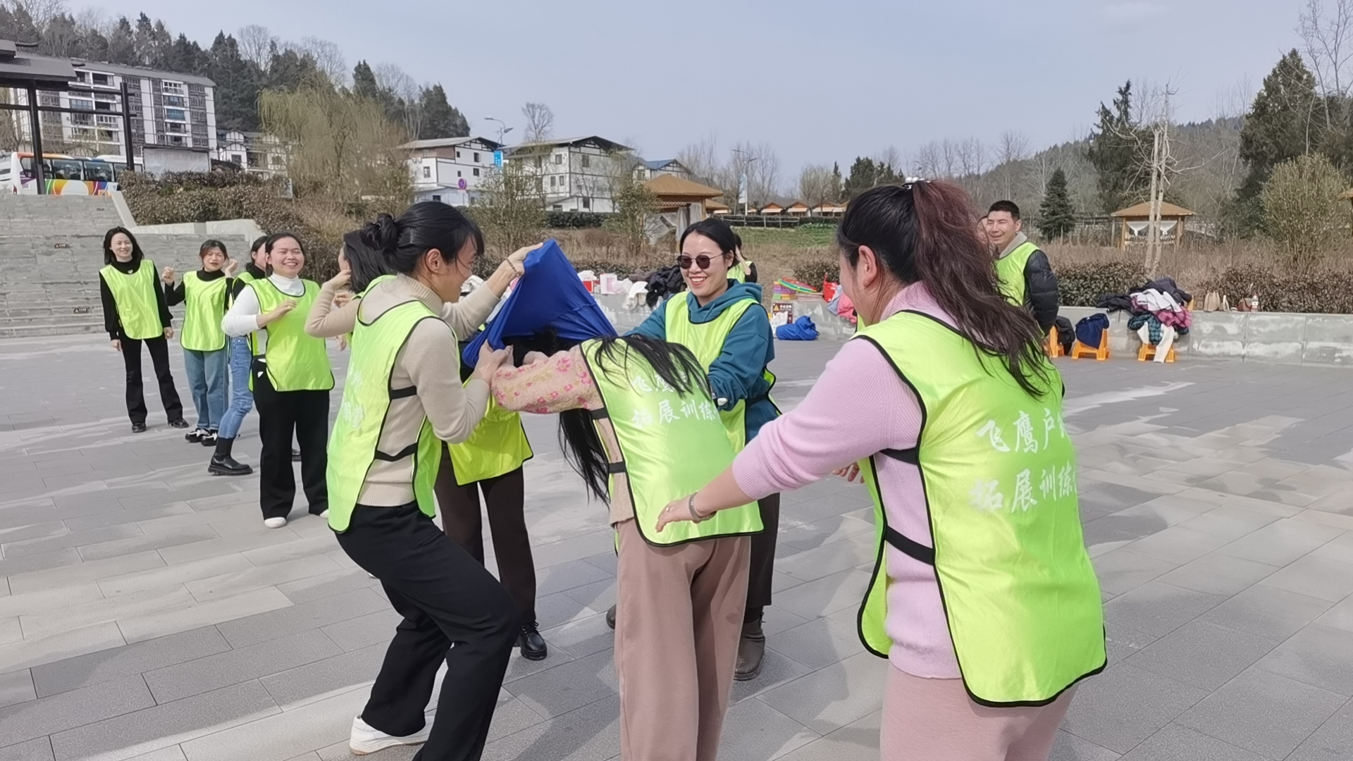 下午,女職工們?cè)隈嗰R水鄉(xiāng)碼頭廣場(chǎng)開展了團(tuán)建活動(dòng)。活動(dòng)開始前,教官按照?qǐng)?bào)數(shù)的順序,將全體參與人員隨機(jī)分成了紅、黃、綠3個(gè)隊(duì),隊(duì)員們通過進(jìn)行輪流交換揉肩、捶背等放松活動(dòng)打破隔閡、消除尷尬,營(yíng)造了歡快活潑的團(tuán)隊(duì)氛圍。